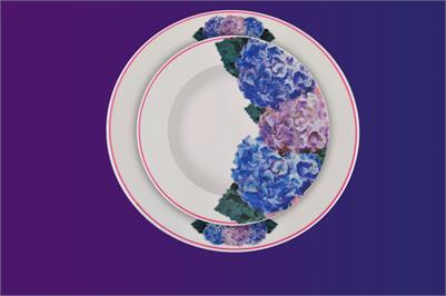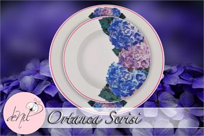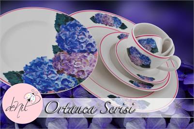Ortanca çiçeğinin romantik havasını sofralarınıza taşıyan seri,renklerin enerjisi ile bambaşka bir deneyime davet ediyor.El dekorlu pembe tonunda kenar filesi ve sulu boya tekniği ile çalışılmış deseni,çiçek tutkunları için oldukça keyifli bir tasarım.