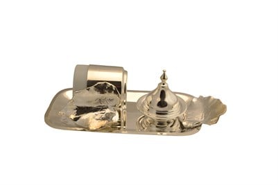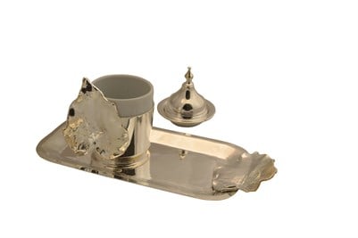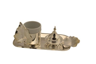 Gümüş yaprak detaylı kahve tepsisi, fincanı ve lokumluğu ile kahve sunumlarınıza şıklık kazandırın.